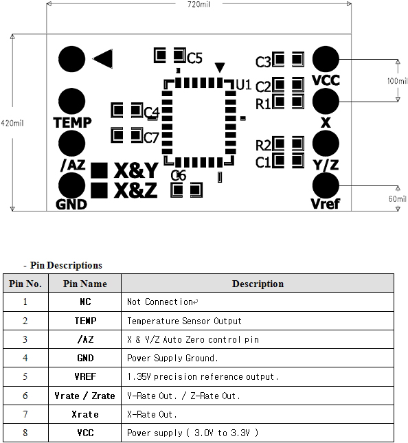 VCCとGNDに信号を3.3VとGNDを印加して、X, Yの出力信号をADCの入力にそれぞれ接続します。角速度モジュールはデジタルコントロールピンなしに、電源だけを印加すると角速度が電圧形態に出力されるので、これをADCを利用してデジタルに変換します。ATMega128の場合、FポートがA/Dコンバーターです。