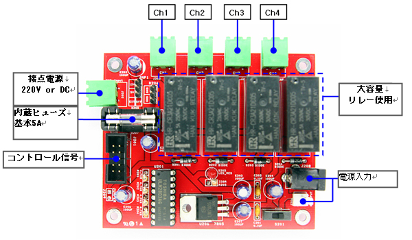 · 4台の装置を駆動することができ、各接点当りに最大AC 250V, DC 30V を使用可能、最大電流は5Aです。