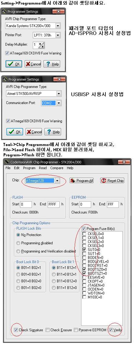 コードビジョン及びポニープログからのセッティング方法[ATMEGA128です。もちろん、USBISPやISPPROを基準にしたものです。それにJTAGICEのような場合には、JTAGENを必ずチェックしなければなりません。ご参考ください。