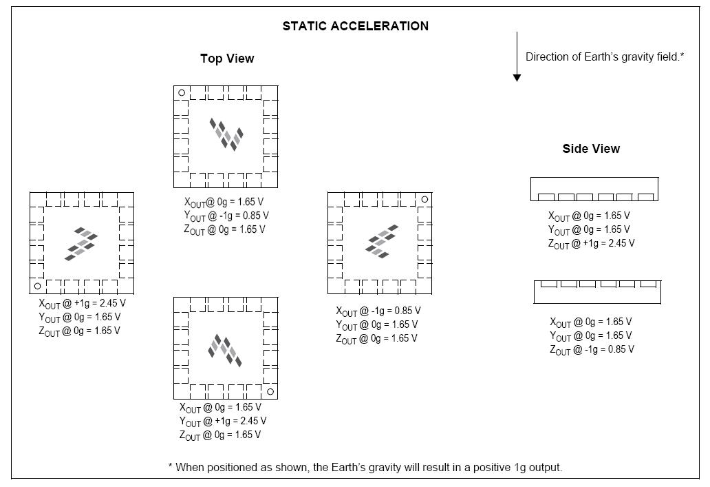 http://www.newtc.co.kr/board/data/pds/AM_3AXIS_3軸センサーテストボード_Ver_2.pdf 簡単に説明すると、1.65Vを基準に1.5gモードの場合、800mV/g単位で電圧値が変わりながら出るようになります。1gというのは、 gはgravityの略字で、重力加速度を意味します。