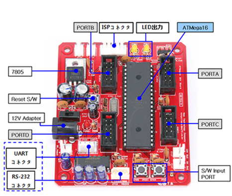 - ATMEL社のAVRマイクロコントローラATMega16の開発ボード