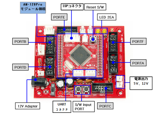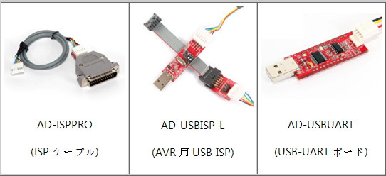 プログラムのダウンロードはAD-USBISP(USB), AD-ISPPRO(プリンタポート)、AD-JTAG(シリアルポート)を利用してダウンロードできます。