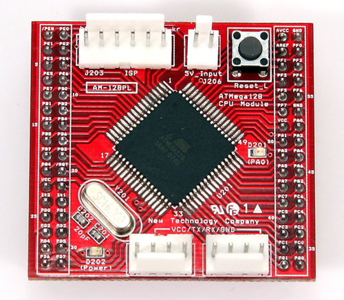 ㆍ ATMega128A-AU AVR 마이크로 컨트롤러 사용 ㆍ 2줄짜리 2.54 Header Pin이 양쪽으로 32PIN씩 배치되어 있음 ㆍ 5V Level로 UART 통신 가능 UART0, UART1 (RS-232통신을 하려면 변환보드 필요) ㆍ ISP 커넥터, 16Mhz X-tal, Reset S/W, 전원 LED 내장 ㆍ 크기 : 47mm * 47mm