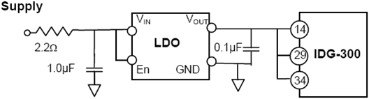 - 센서에 들어오는 전원 노이즈는 아래 그림과 같이 설계하면 줄어들 수 있습니다. 아래에서 LDO가 저주파 노이즈를
