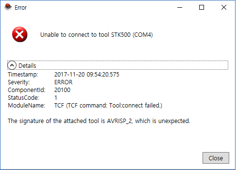 안녕하세요. Atmel Studio 7.0을 설치하고 AD-USBISP V03.5를 사용해서 펌웨어 다운로드를 시도했지만, 첨부파일과 같은 에러가 발생해서 V03.6으로 업그레이드 요청 드려 업그레이드 했습니다. 하지만, 동일한 문제가 발생되어 Atmel Studio 6.0으로 설치했는데, 동일한 에러가 발생합니다. 해결책을 문의 드립니다. 수고하세요.