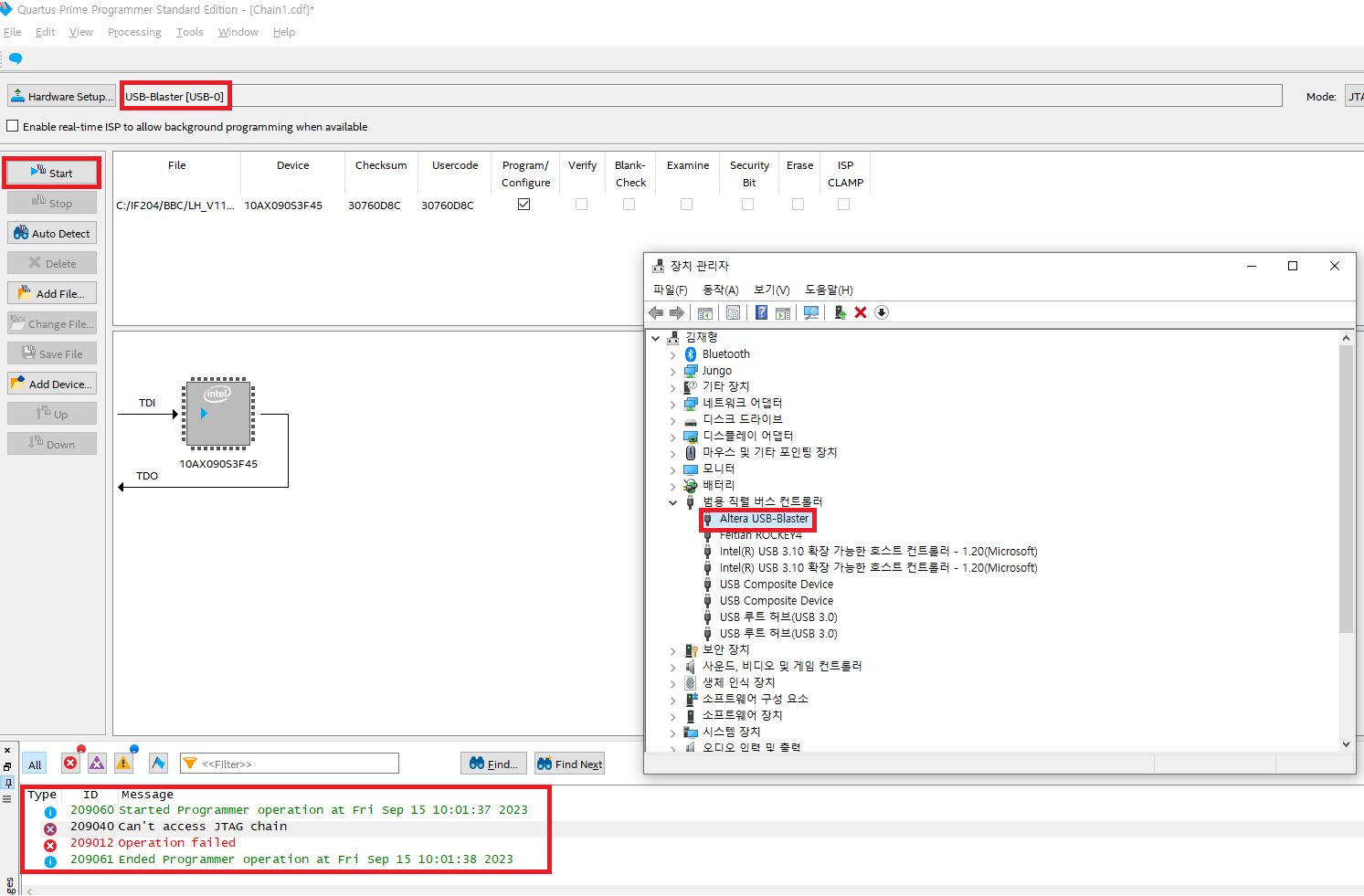FPGA File Download (START) 진행 시 Can't Access JTAG Chain 과 같은 문구 발생