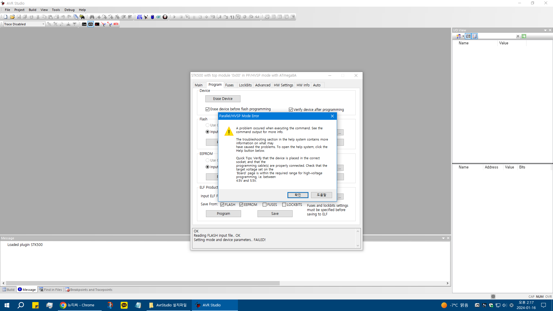 최근에 회사에서 컴퓨터를 바꾸면서 운영체제 변동(Win7 → Win10)이 있었습니다. 뉴티씨에서 제공하는 AVRstudio 프로그램과 관련 드라이버를 재설치했습니다만, 마지막에 프로그램을 기록하는 과정에서 오류가 발생합니다. - OS : Windows 10 (64bit) - 프로그램 : AVRstudio 4.19 / 드라이버 : AD-USBISP V6.0 2017년