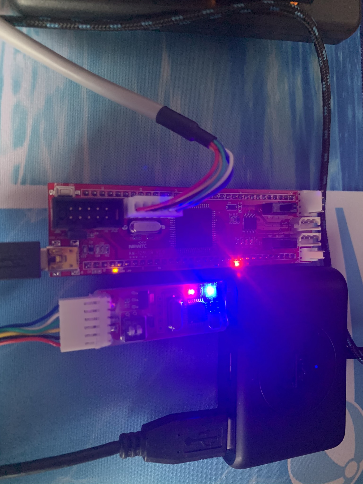 사진과 같이 AM-128 USB V2.0 에 AD-USBISP를 연결했을 때 빨간색이 점멸합니다. 방금 전 A/S담당 직원분께서 AM-128 보드에 문제가 있다고 하시어서 배송 주소도 남깁니다.
