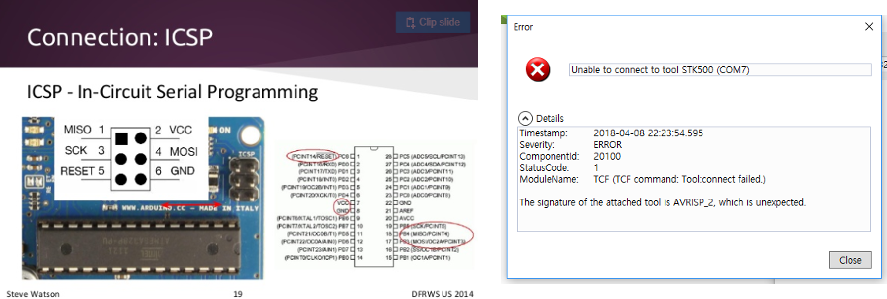 안녕하세요. AD-USBISP V03.5를 이용해 Arduino Flash read/write를 해보려고 합니다. 그래서 AtmelStudio - Tools - Device Programming으로 연결을 시도하였으나, 그림과 같이 오류가 발생합니다. (COM 포트를 바꾸어 보아도 동일합니다.) (아두이노 보드에는 5v 전원을 인가하였습니다.)
