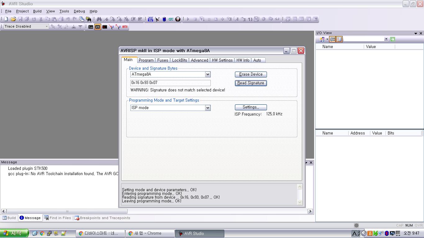 테스트에 사용한 프로그램은 AVR Studio 4이고 프로그래머는 AVRISP mk2입니다.
